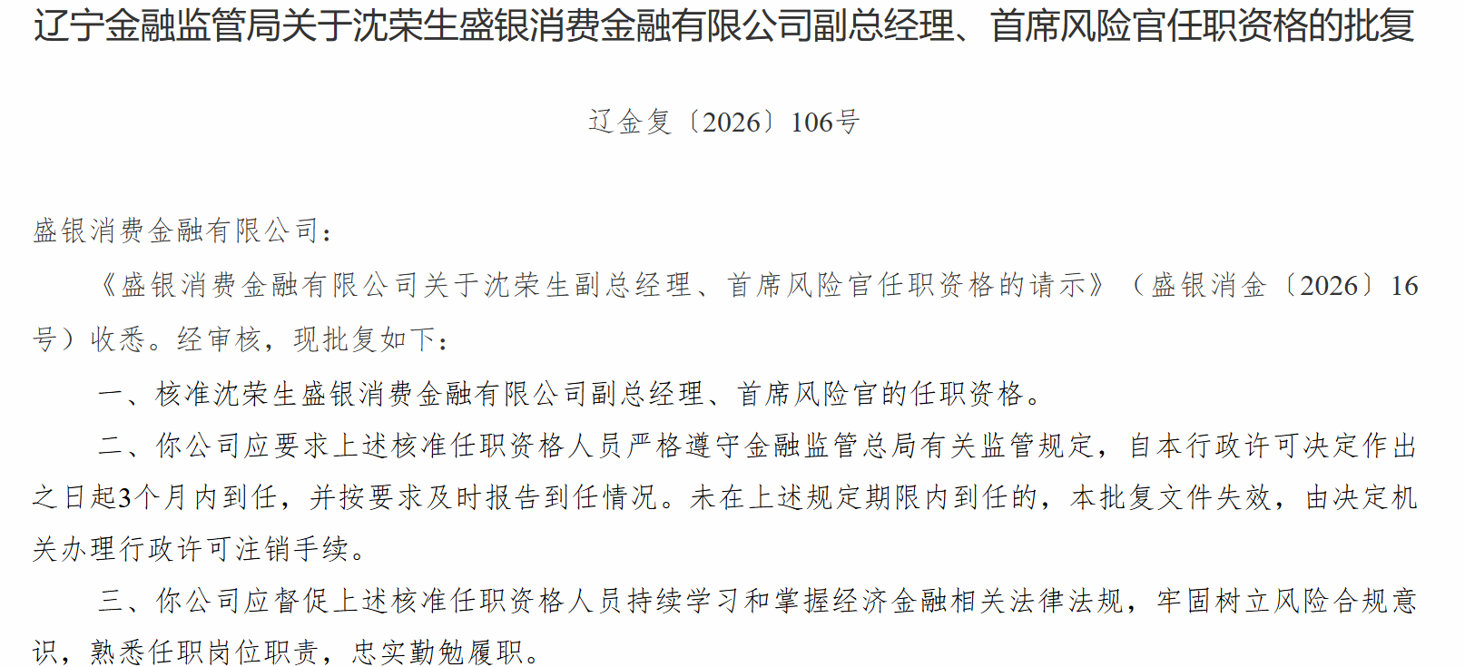 4月27日,辽宁金融监管局发布关于沈荣生盛银消费金融有限公司副总经理、首席风险官任职资格的批复,核准沈荣生盛银消费金融有限公司副总经理、首席风险官的任职资格。