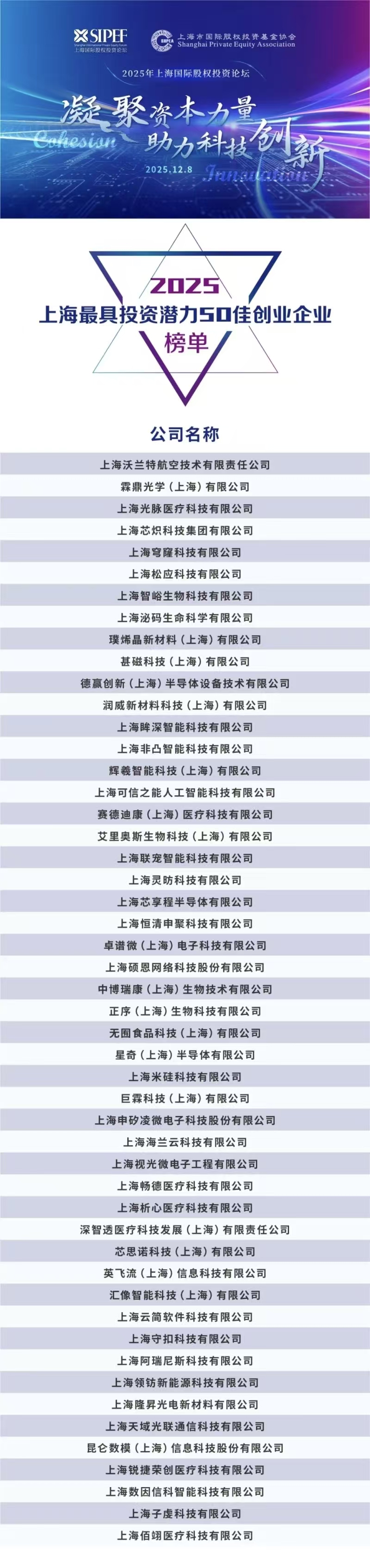 “2025上海最具投资潜力50佳创业企业评选”榜单今天在“第十八届上海国际股权投资论坛”(SIPEF)上正式揭晓宏泰,沃兰特、霖鼎光学、光脉医疗等50家企业入选。据不完全统计,今年上榜企业平均新增股权融资约1.07亿元,超70%的企业处于A轮及以后融资轮次;往届上榜企业融资规模超1652.8亿元,平均每家第二年新增股权融资达2240万元,其中,2024年上榜企业新增股权融资总计29.1亿元,为企业后续融资提供强大背书。