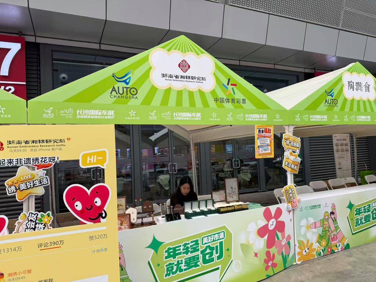 在“年轻就要创”美好市集,孩子们可以体验指尖上的非遗,由湖南省湘绣研究所带来的市集专属双重福利。在市集摊位购买任意湘绣产品即可获赠 「湘绣专属体验券」1张,凭券可前往湖南省湘绣研究所兑换深度参观体验,还有专业老师指导的双面绣团扇刺绣实操课程。同时,发布市集打卡笔记,带上话题#湘绣市集奇遇记 #非遗湘绣传承并@湖南省湘绣研究所官方账号,即可现场兑换 「湘绣刺绣布贴」1份。