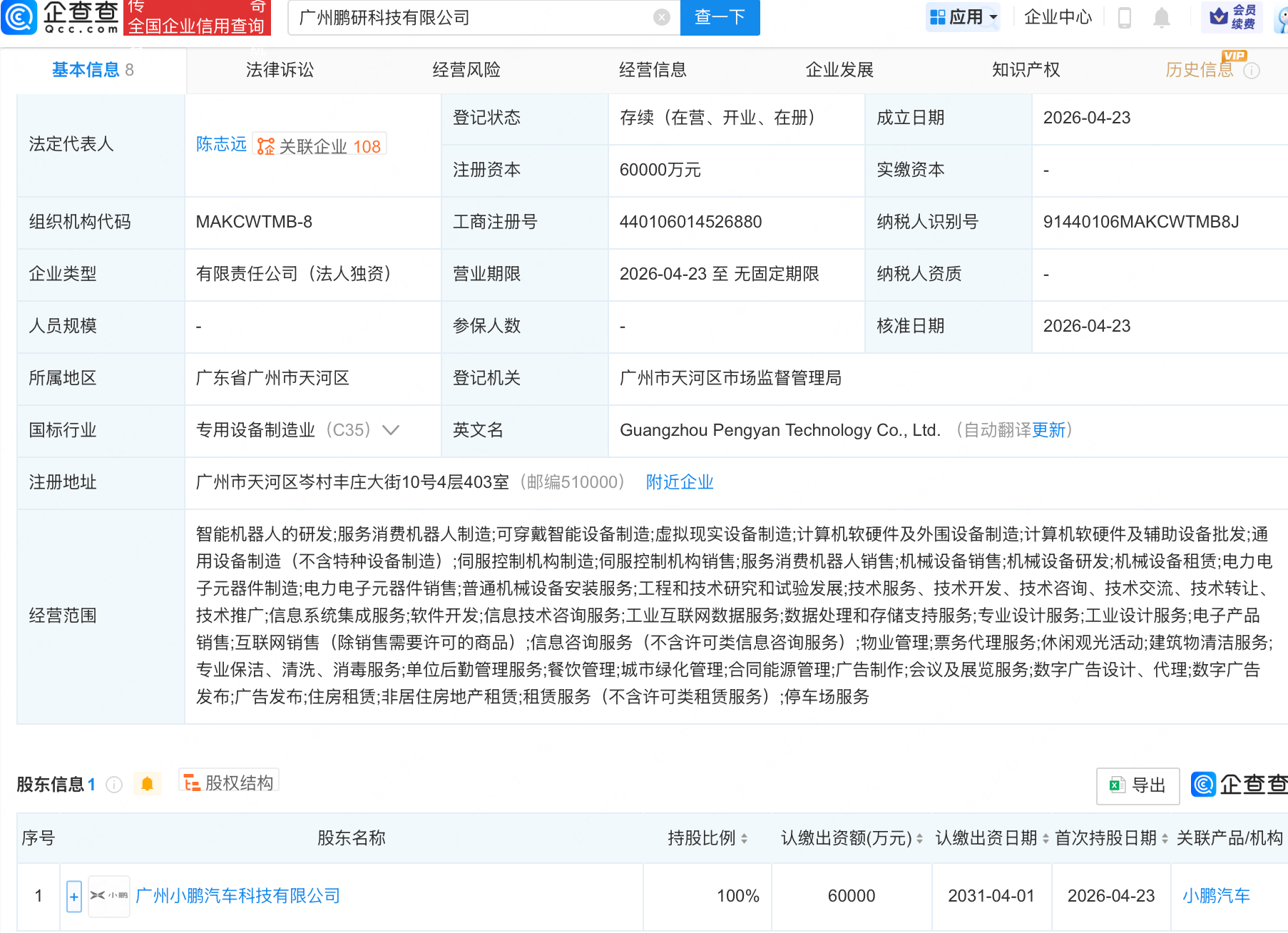 近日,广州鹏研科技有限公司成立,注册资本6亿元,经营范围包含:智能机器人的研发;服务消费机器人制造;可穿戴智能设备制造;虚拟现实设备制造等。企查查股权穿透显示,该公司由广州小鹏汽车科技有限公司全资持股。